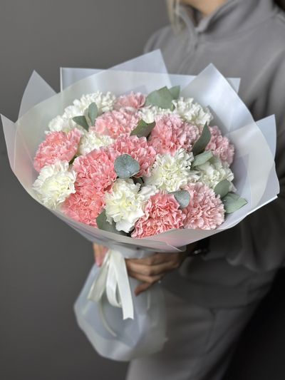 Букет из 19 нежных диантусов с эвкалиптом