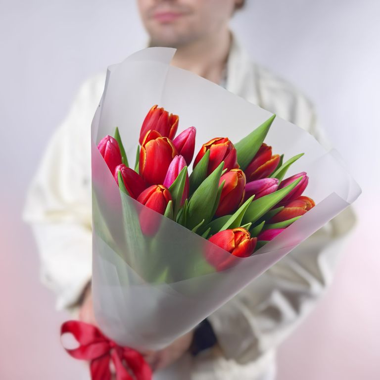 Этот роскошный букет из 15 тюльпанов — истинное воплощение весеннего настроения! Яркие цветы насыщенных оттенков — от глубокого красного до сочного малинового с золотистыми переливами у основания лепестков — собраны в пышную, объёмную композицию. Каждый тюльпан выглядит свежим, упругим, с идеально раскрытыми бутонами, которые создают ощущение живой, пульсирующей красоты. Букет оформлен с изысканной простотой: цветы аккуратно завернуты в полупрозрачную матовую плёнку, которая подчёркивает их естественную элегантность, не отвлекая внимания от самих цветов. У основания композиции — яркая красная лента, завязанная в изящный бант. Она добавляет букету торжественности и завершённости, становясь стильным акцентом.