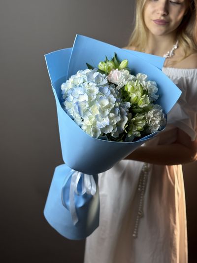 Букет с голубой гортензией , диантусом и альстромерией