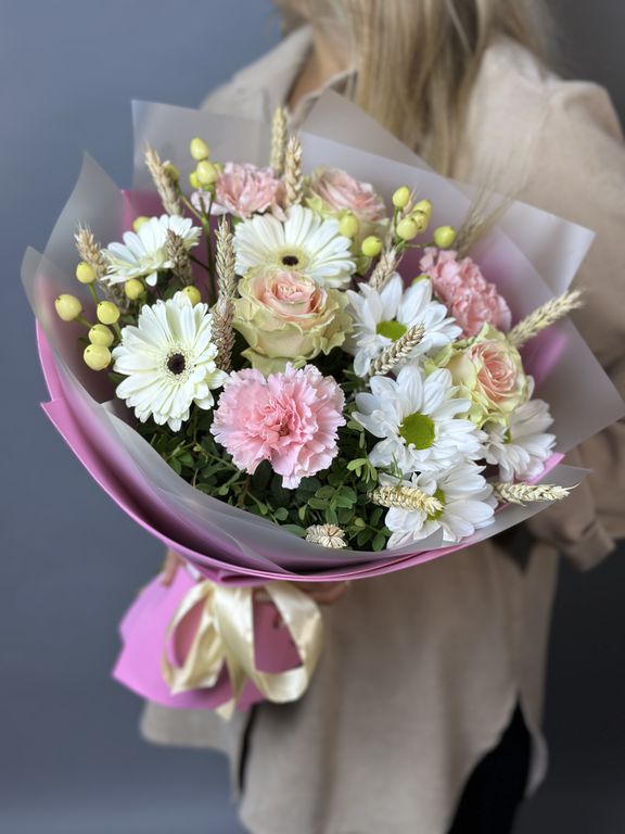 *Возможны замены некоторых сортов цветов (из-за ограничения сезонности, поставки) на релевантные или иные похожие сорта с сохранением визуального эффекта и настроения, объёма, палитры и стоимости продукта, с обязательным согласованием замен с заказчиком.