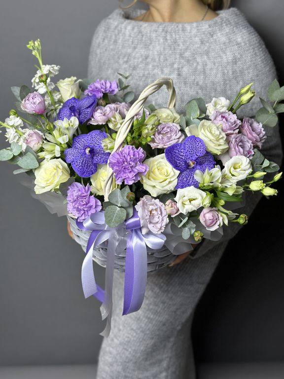 роскошная корзина с лавандовой вандой , розами,эустомой Для теплых встреч и приятных эмоций.
