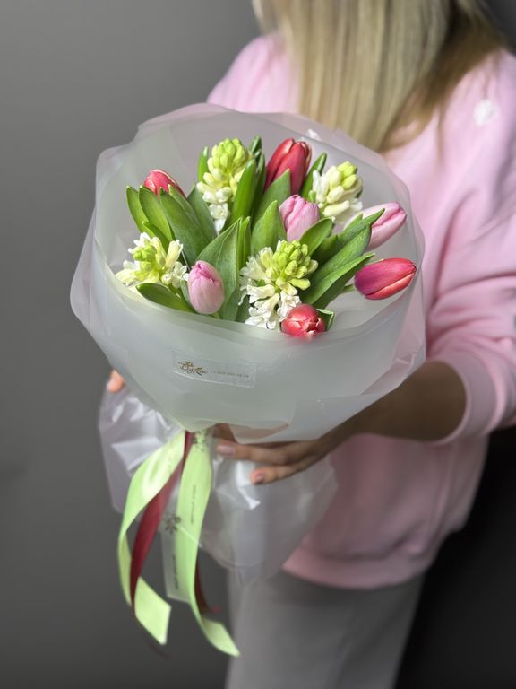 Весенний букет из тюльпанов и ароматных гиацинтов