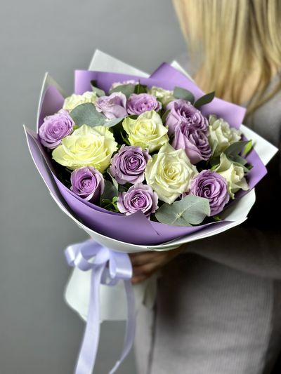 Букет из 17 бело-сиреневых роз с эвкалиптом
