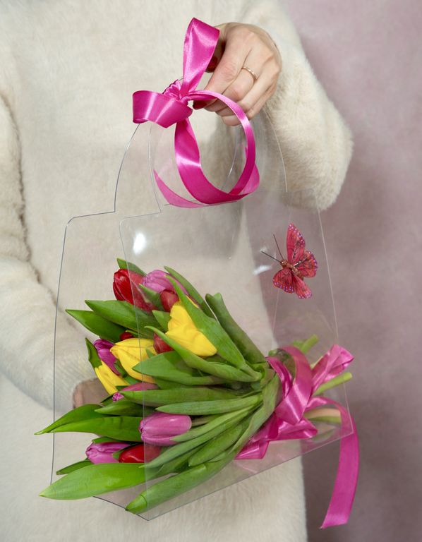 Букет из 15 разноцветных тюльпанов с сумочке