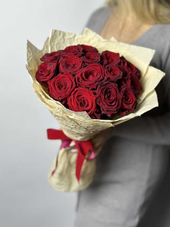Букет из 15 красных роз в крафте