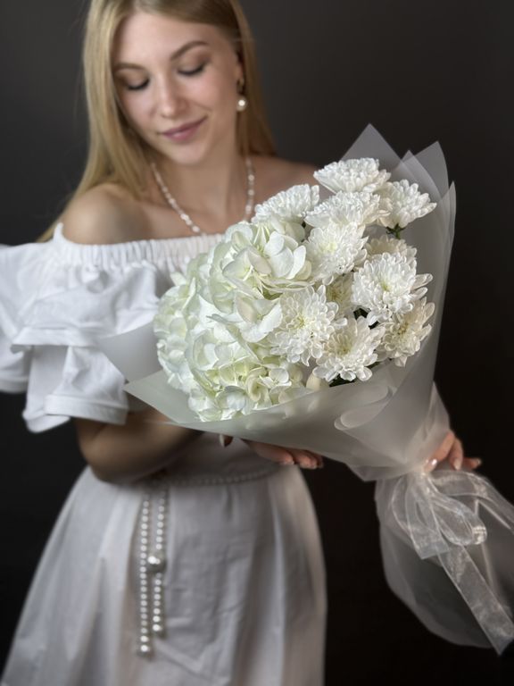 Небольшой букет с белой гортензией и хризантемой