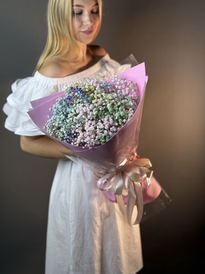 Этот яркий и жизнерадостный букет из 7 цветных гипсофил — настоящее воплощение весеннего настроения! Нежные соцветия в оттенках розового, голубого, зелёного и белого создают гармоничную композицию, которая словно наполнена солнечным светом и радостью. Гипсофилы символизируют искренность и чистоту, а их разноцветные лепестки добавляют букету игривости и оригинальности. Букет оформлен в стильной упаковке, которая подчёркивает его лёгкость и воздушность. Такая композиция станет отличным подарком для тех, кто ценит яркие эмоции и необычные решения. Она идеально подойдёт для поздравления с праздником, поднятия настроения или просто для того, чтобы сделать день особенным.