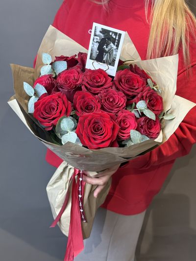 Букет из 15 красных роз с эвкалиптом