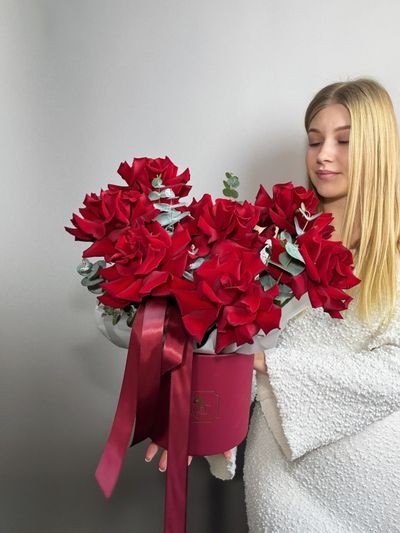 Композиция из 7 красных французских роз с эвкалиптом