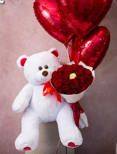 Букет из красных роз +Мишка+ 3 сердца