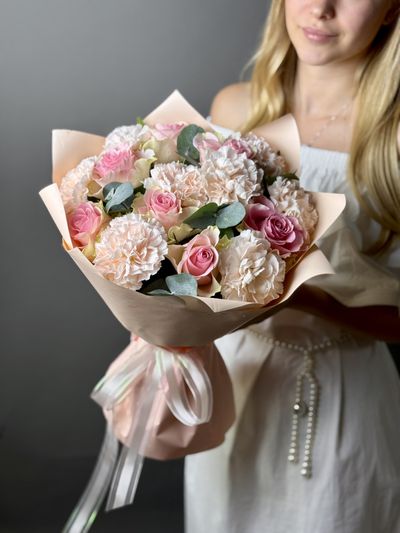 Букет из розовых роз и диантусов с эвкалиптом