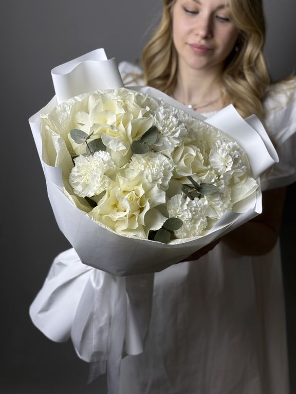 Букет из белоснежных диантусов и французских роз 2 990 ₽ В корзину Купить в 1 клик В корзину Купить в 1 клик В составе -роза мондиаль 3 шт -диантус 6 шт -эвкалипт 1 -упаковка,лента В составе -роза мондиаль 3 шт -диантус 6 шт -эвкалипт 1 -упаковка,лента Поделиться