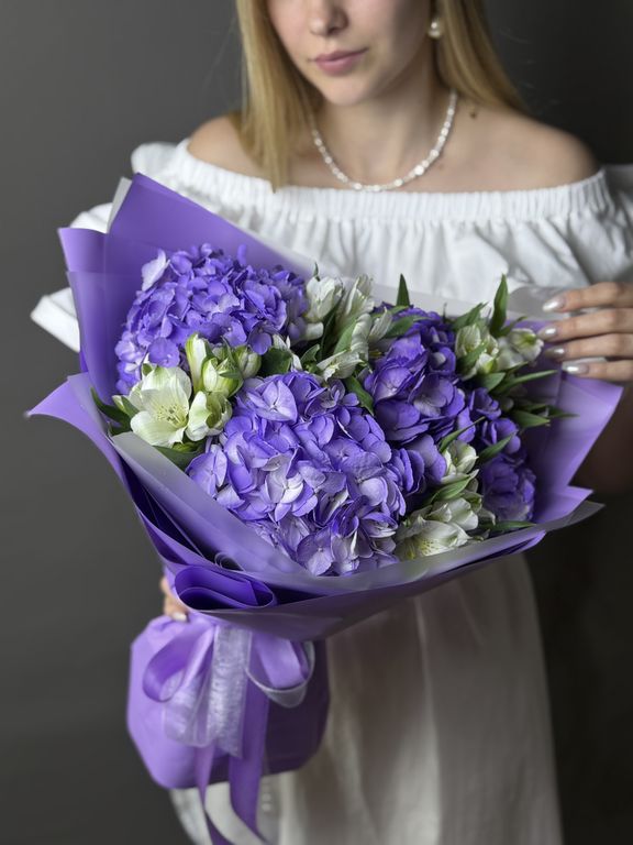 Букет с 3 фиолетовыми гортензиями и белыми альстромериями