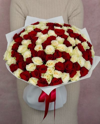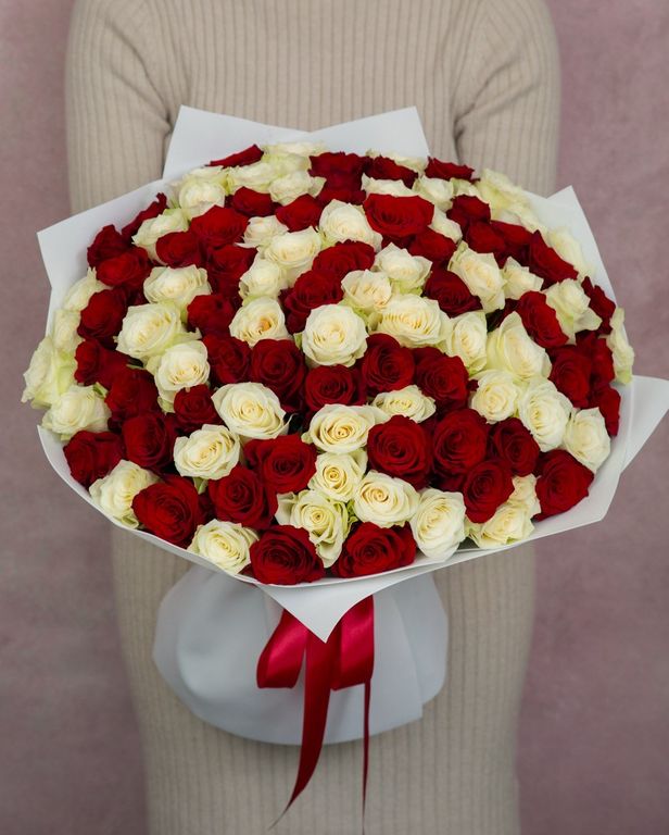 Мы гарантируем свежесть и высокое качество каждого элемента букета, а быстрая и надежная доставка сделает ваш подарок еще более приятным сюрпризом. Порадуйте своих близких этим роскошным букетом из красных и белых роз и подарите им мгновения счастья!