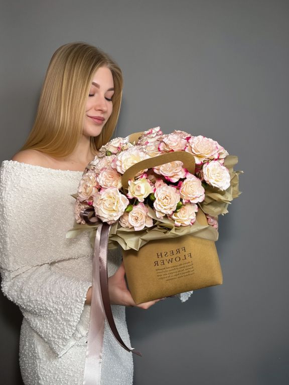 Описание: Эта потрясающая композиция из кустовых роз, расположенных в элегантной сумочке, станет великолепным подарком для любого повода. Нежные оттенки роз придают этому букету романтический и утонченный вид.