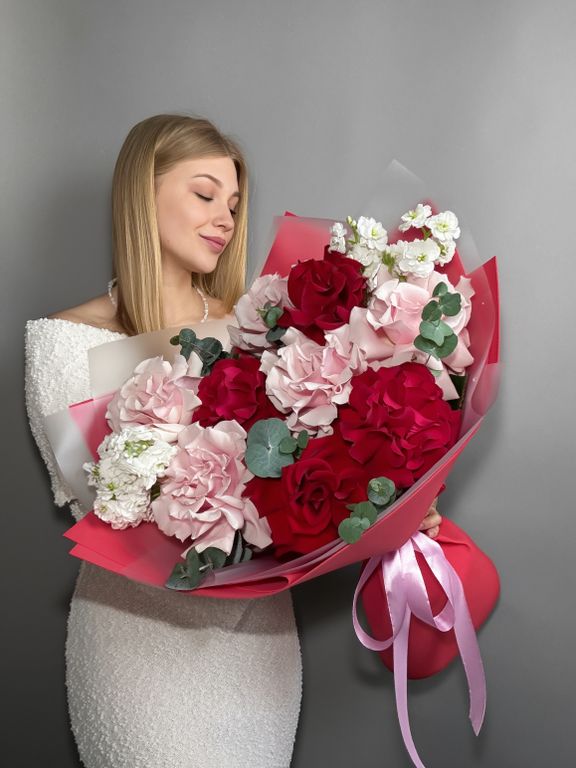 Авторский букет с розовыми французскими розами и маттиолой