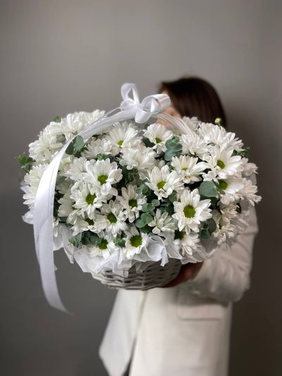 Корзина с ромашками и веточками эвкалипта