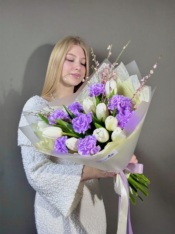Букет из белых тюльпанов и сиреневых диантусов