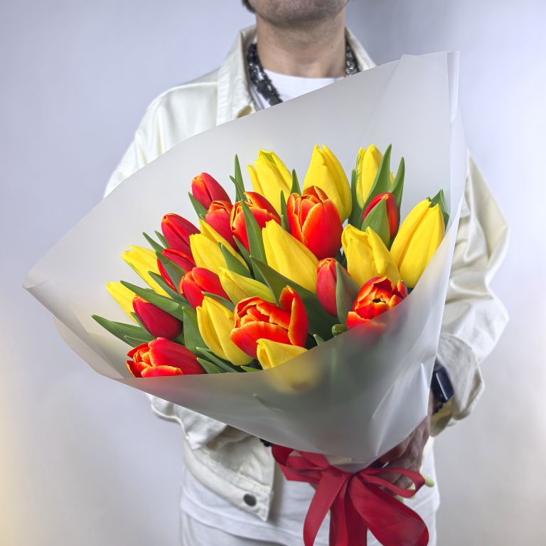 Букет из 25 желто-красных тюльпанов