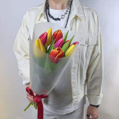 Разноцветные тюльпаны 9 шт в матовой пленке